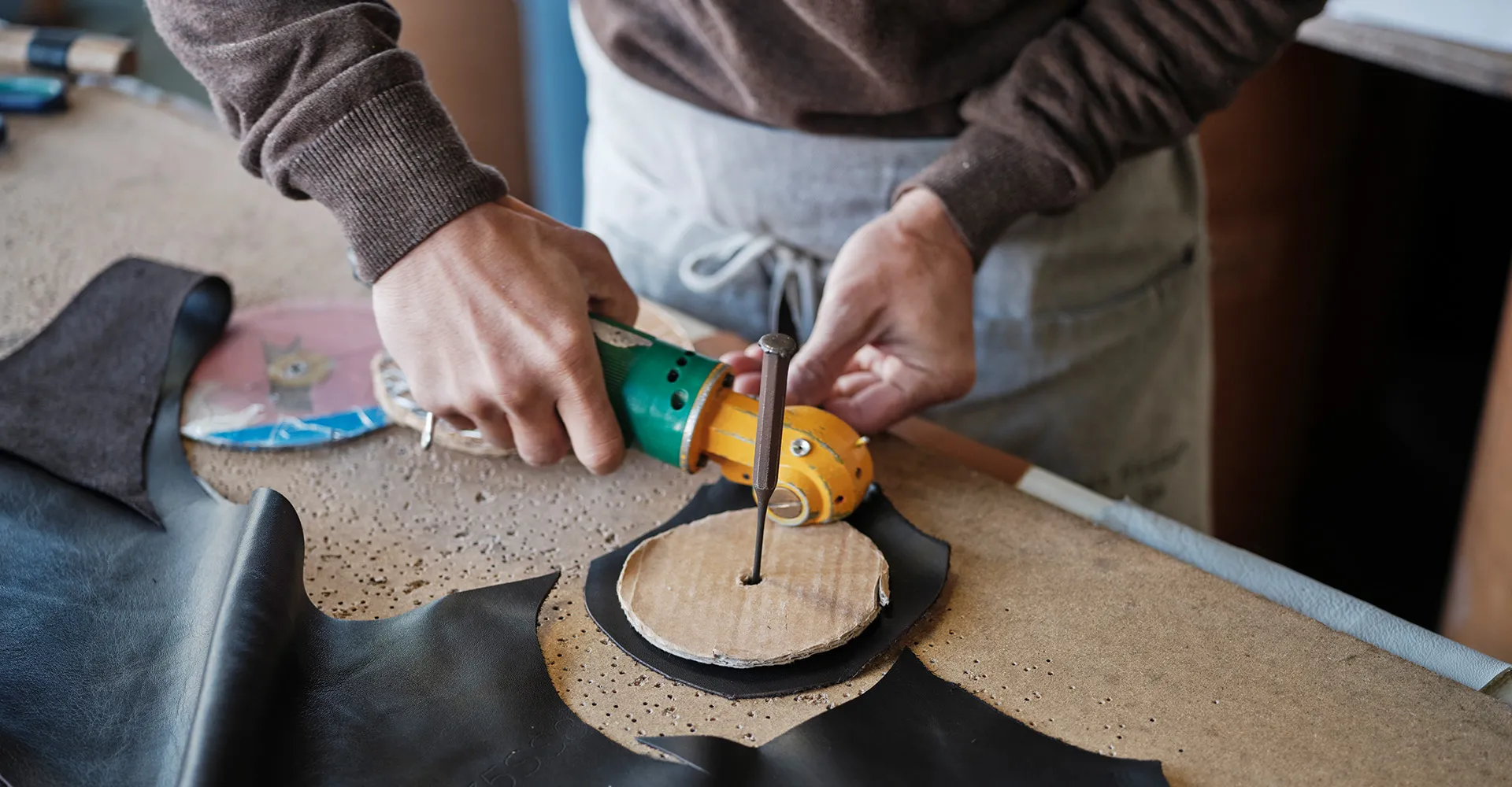 Leren stroken die op traditionele wijze worden geweven met ‘schering en inslag’ — aan de kern van het ambacht is niets veranderd. Behalve dan de eigenaar zelf. In 2007, na het overlijden van Charles Schambourg, nam Nicolas Berryer — voormalig zakenbankier, levensgenieter en drummer — het failliete bedrijf over. ‘Textiel deed me niets. Ik wist niets van geweven leer en was niet op zoek naar een investering. Maar ik was het jachtige Londense bankleven beu,’ vertelt hij.